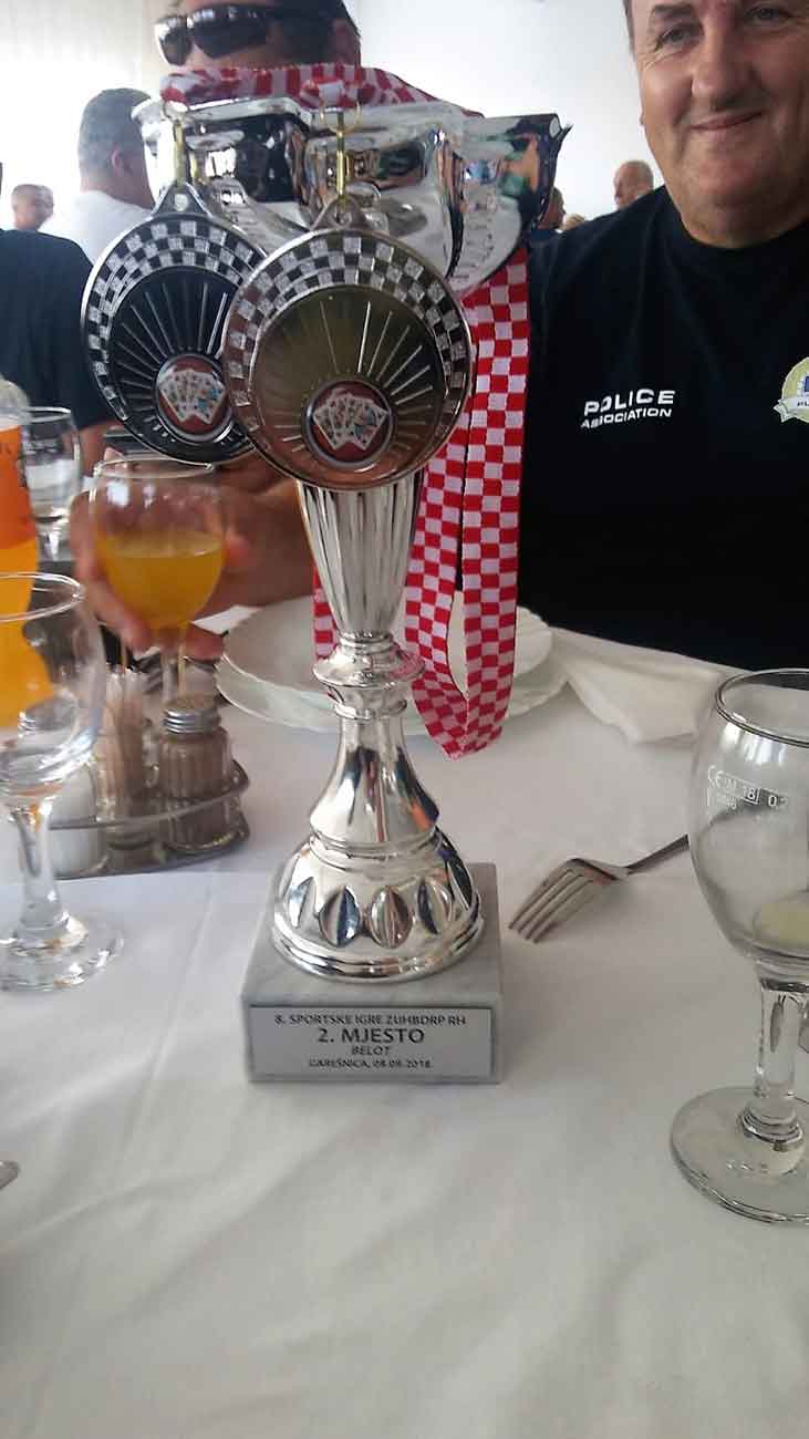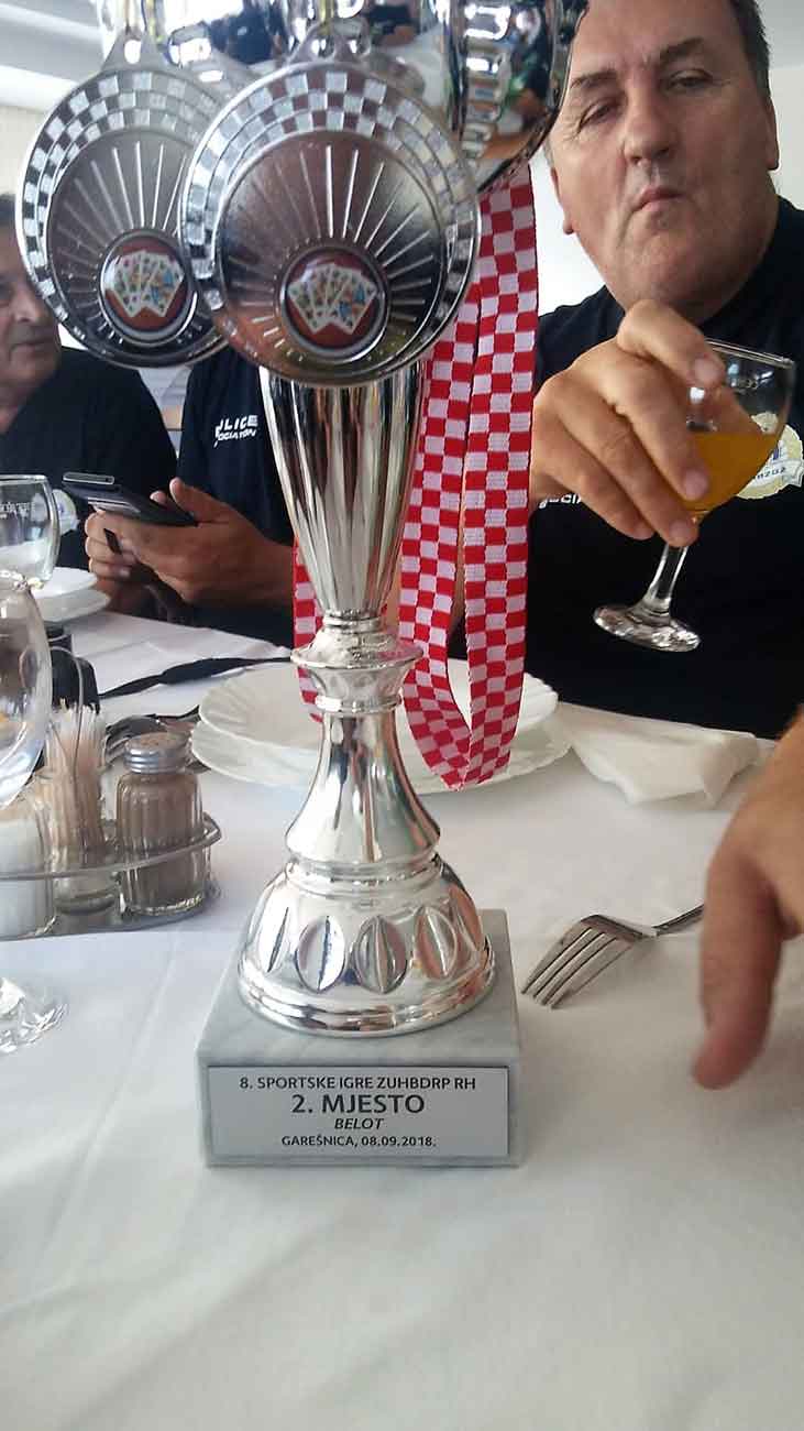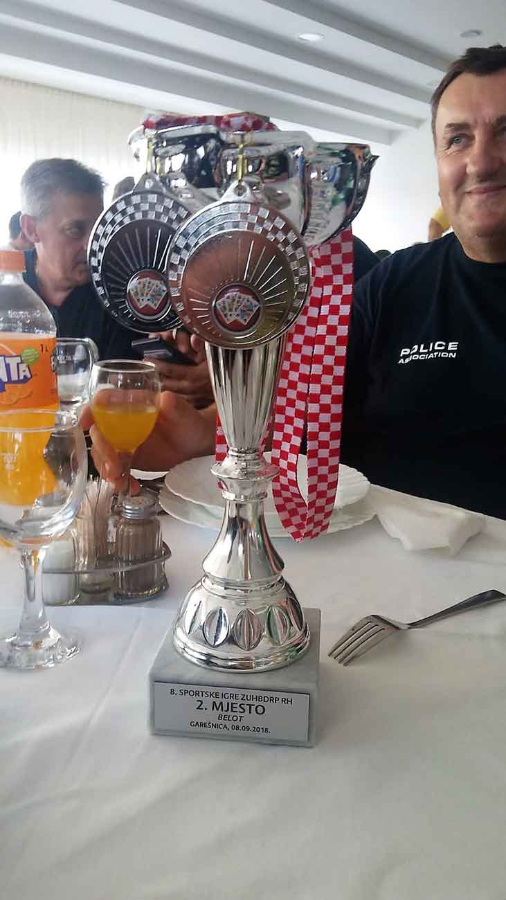 Dana, 08.09.2018.u Garešnici su održani 8. Sportski susreti Udruga hrvatskih branitelja domovinskog rata policije Republike Hrvatske. Organizator igara bila je Zajednica udrugahrvatskih branitelja domovinskog rata policije Republike Hrvatske(ZUHBDRP RH) a pod pokroviteljstvom Ministarstva hrvatskih branitelja.Domaćin ovih 8. Po redu igara bila je Udruga hrvatskih branitelja domovinskog rata policije Garešnica iz Garešnice. Nakon postrojavanja petnaest braniteljskih ekipa u novoj garešničkoj sportskoj dvorani i nakon održanih prigodnih govora igre je otvorio ministar hrvatskih branitelja Tomo Medved. Policijski veterani Domovinskog rata iz cijele Hrvatske natjecali su se u malom nogometu, streljaštvu, stolnom tenisu, ribolovu, šahu i beli. Naši članovi Sabid Orlić i Josip Horvat koji su se natjecali u Beli osvojili su zavidno II mjesto te našoj udruzi donijeli prvi pehar i srebrne medalje. Od srca im čestitamo na tome. Po završetku natjecanja usljedila je dodjela pehara i medalja, a potom druženje uz ručak i tamburaše koji su održani su u hotelu Garić.